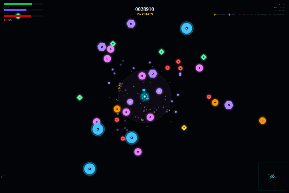 My current favourite build: Orbit Orbs + Chain Lightning + Damage Field. Everything around you melts. But the Kernel bosses that spawn every 2 minutes will test any loadout.